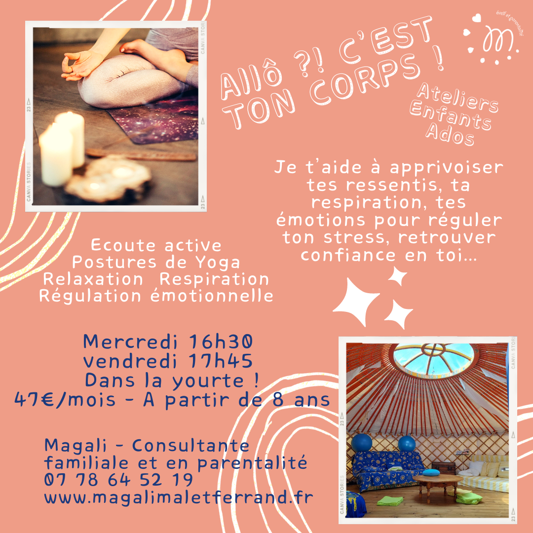 Cet atelier leur permettra de retrouver du calme intérieur, de ressentir leur corps, leurs sensations, leurs émotions grâce à des techniques douces : postures de yoga, respirations, relaxation, régulation émotionnelle et écoute active.